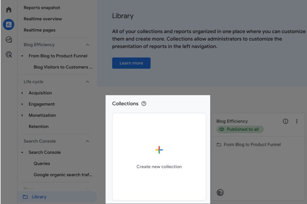 - Go to the Reports area in the left panel on your GA4 Dashboard, discover the Library choice at the bottom left of the report section.