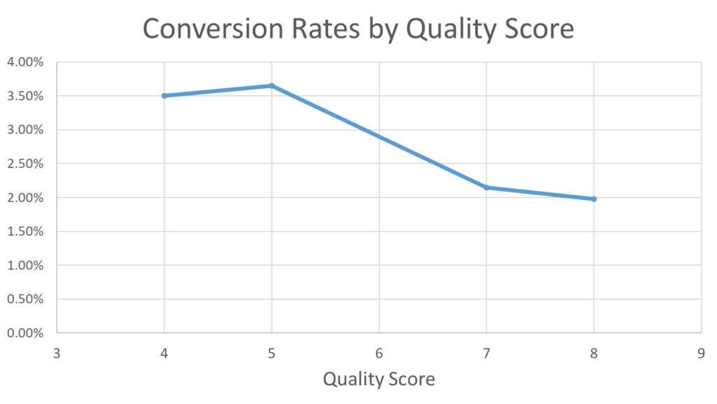 We have a client who specialized in factory parts, and when we graph their conversion rates by Quality Score, we can see that as Quality Score rises, conversion rates fall.